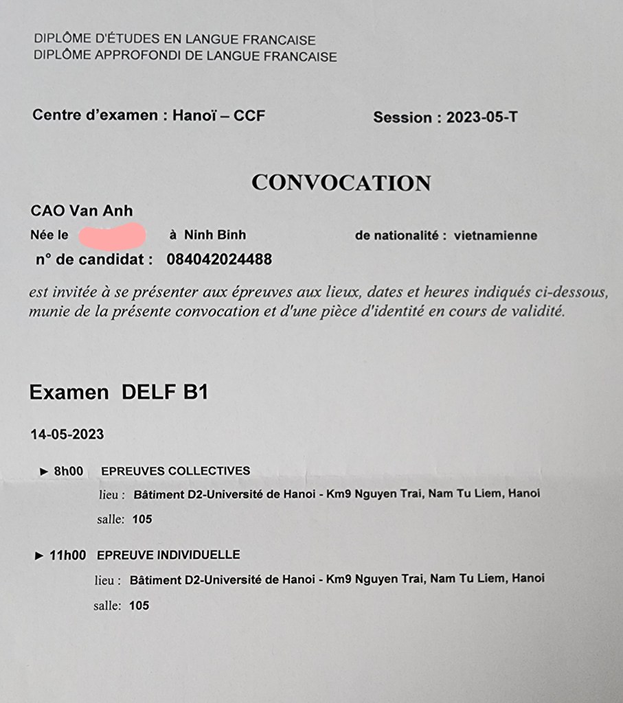 Lemme tell you a bit about my taking the French Proficiency test. First, I was confused about choosing the DELF B1 at the Institut français de Hanoi or VSTEP at ULIS. Then, after a while of brainstorming, I decided to register for the DELF B1 on 14 May 2023. The booking cost me 1.3 million VND, which was pretty reasonable for its lifetime validity. However, I was too worried about my current level. But what could I do then? Just keep on trying.