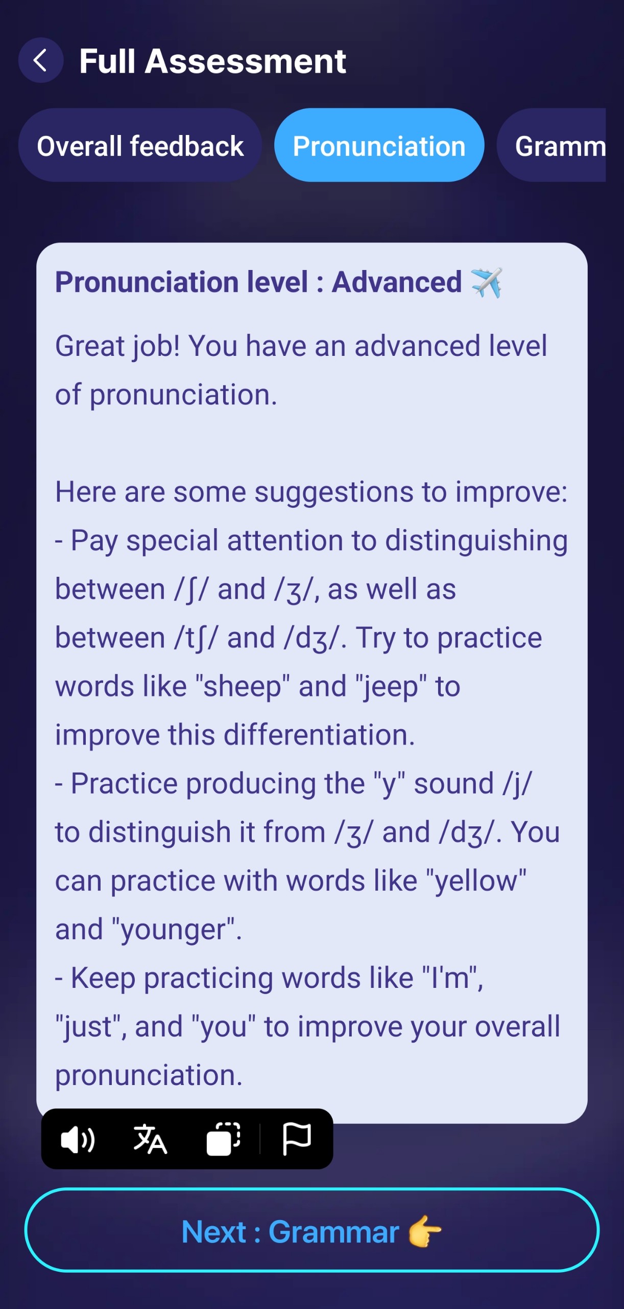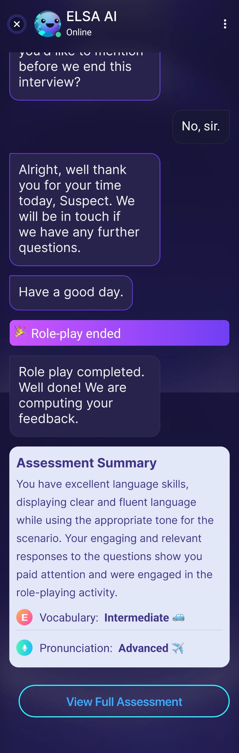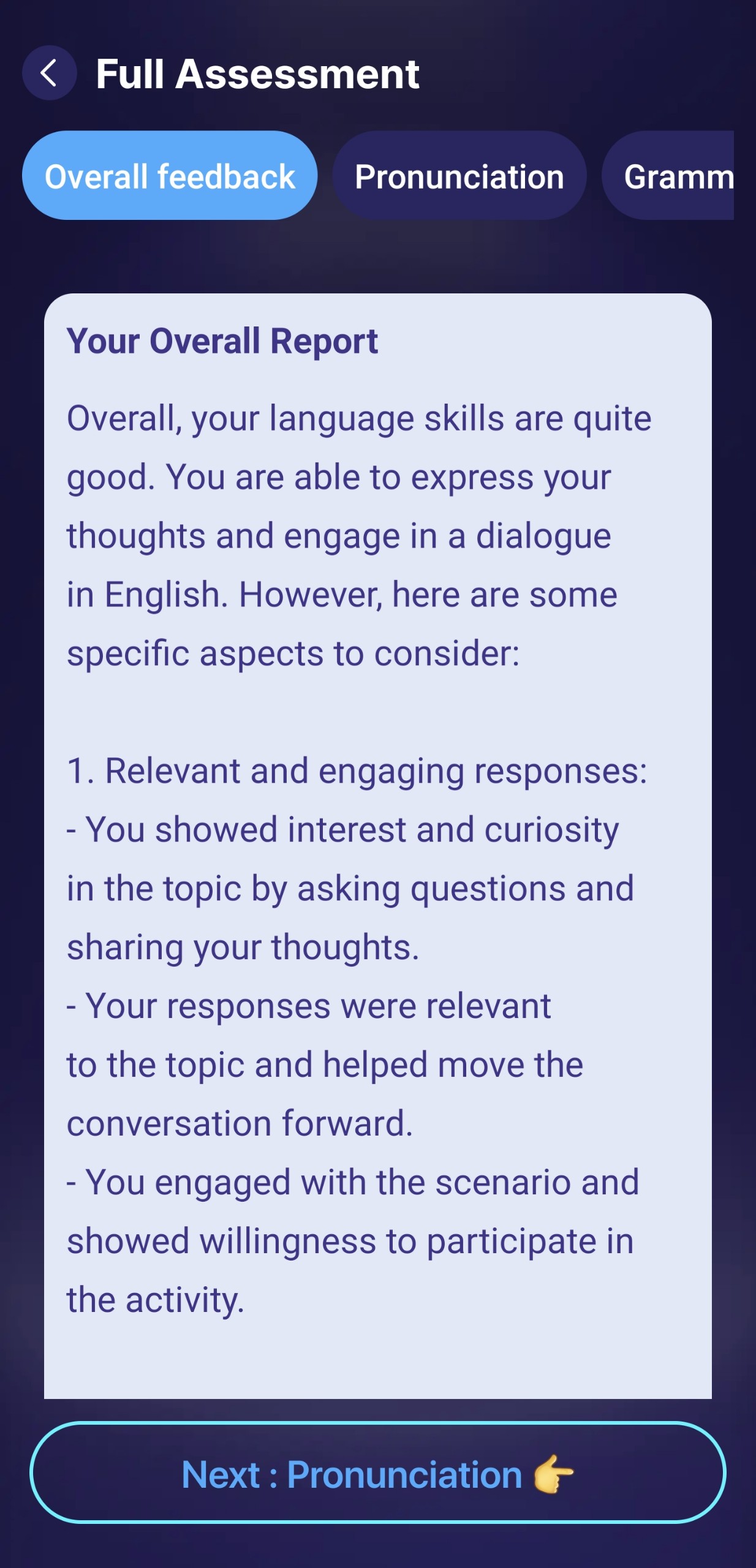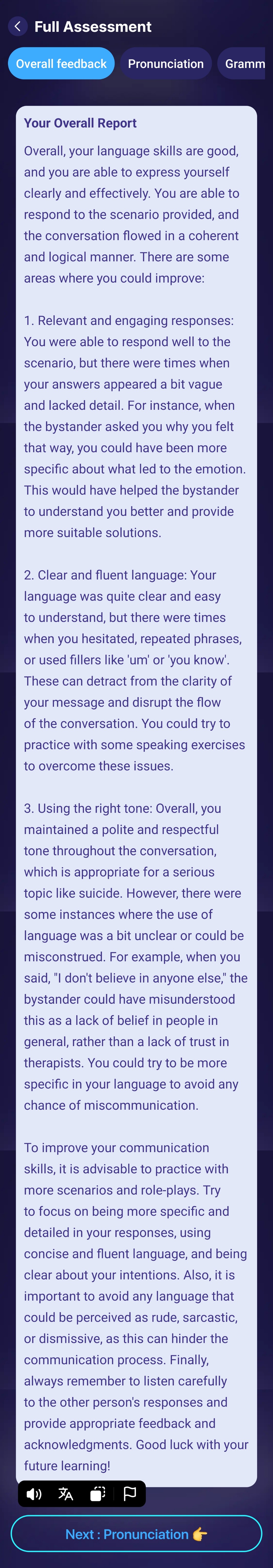 At first, I thought ELSA AI was just like other virtual assistants like Bixby, Siri, Bard,… like an AI friend to talk to while we feel bored. However, with its detailed comments and suggestion for learner’s progress on different aspects (grammar, pronunciation, vocabulary), ELSA is more like a “teacher” rather than a mere assistant.