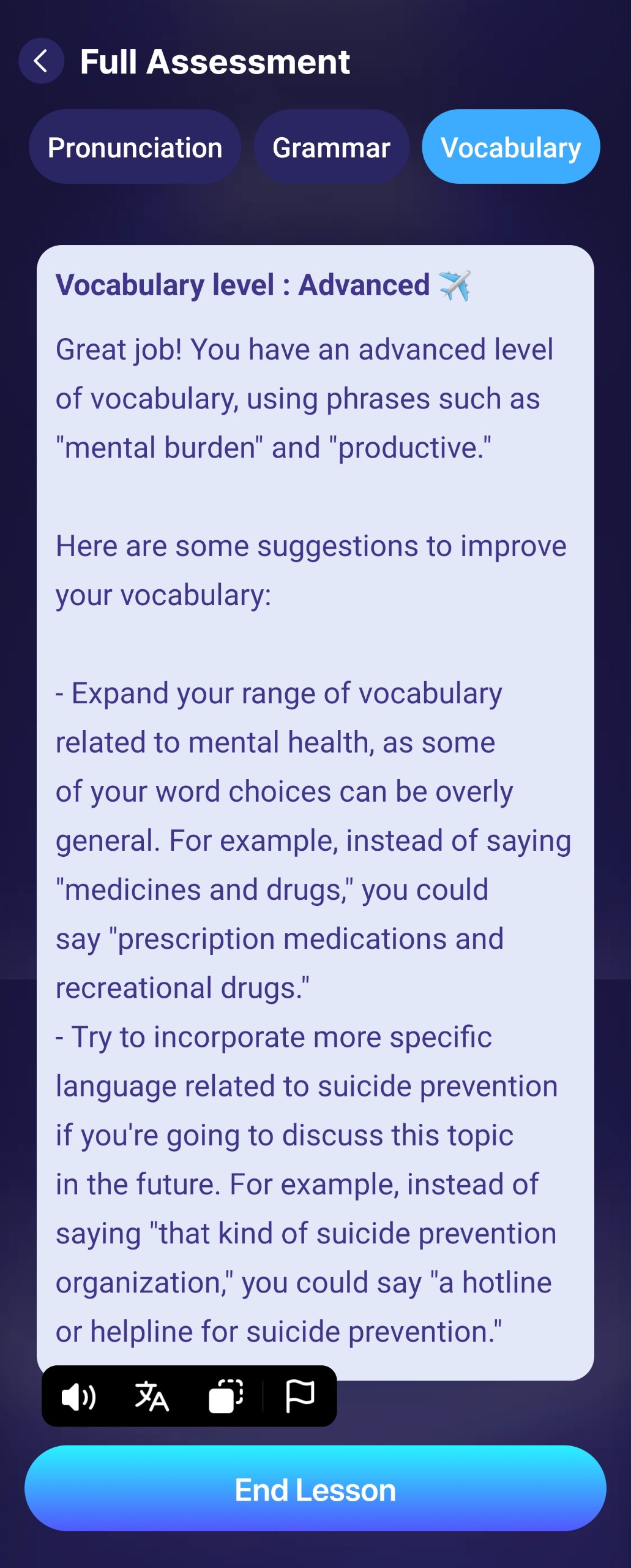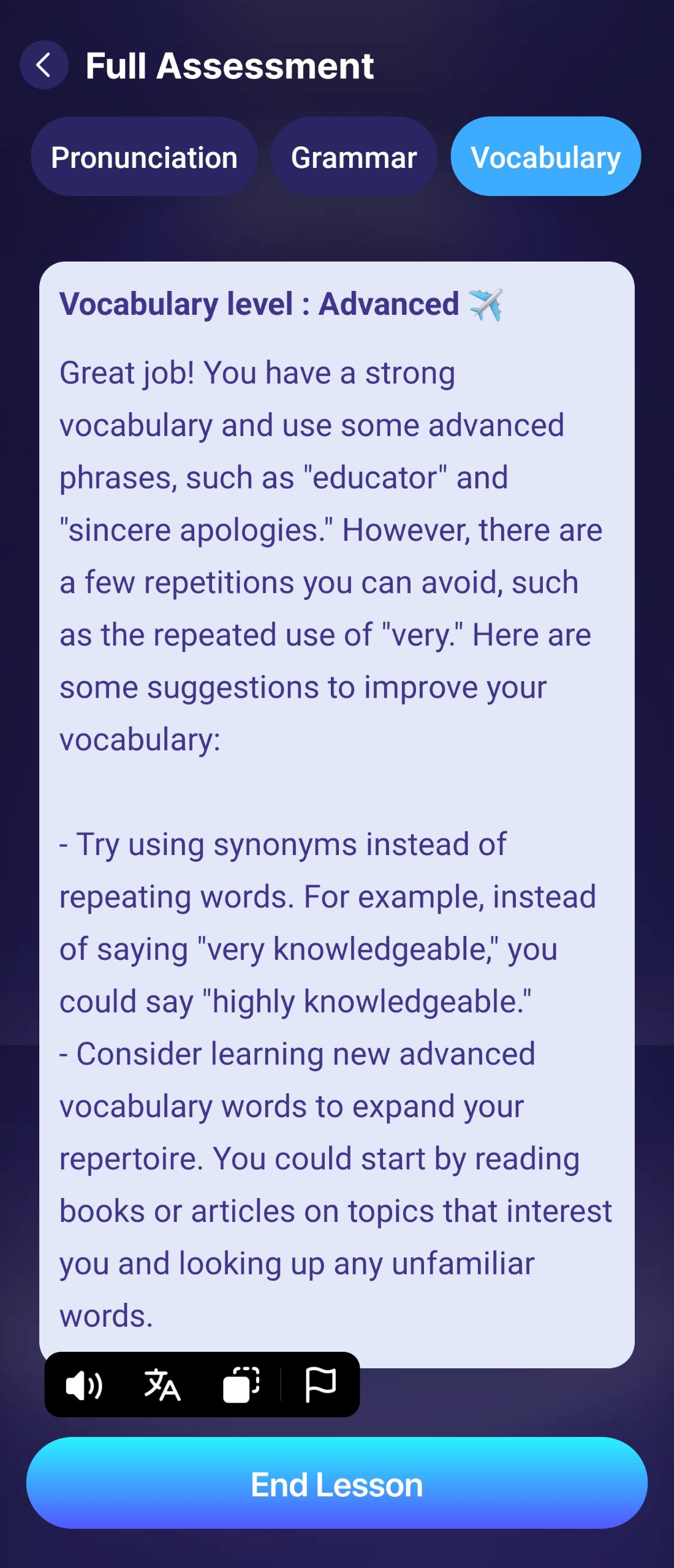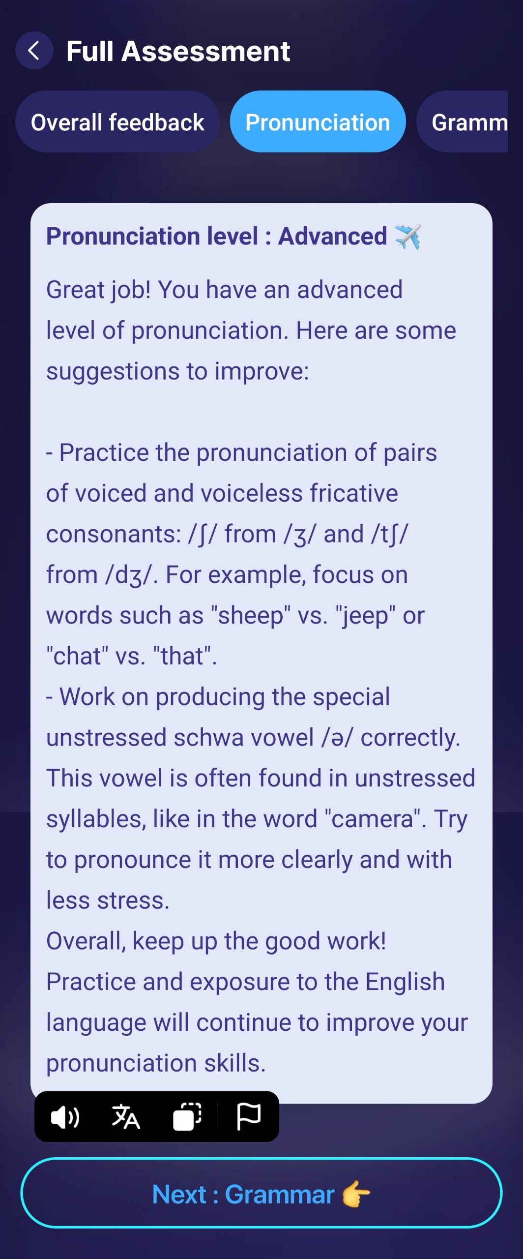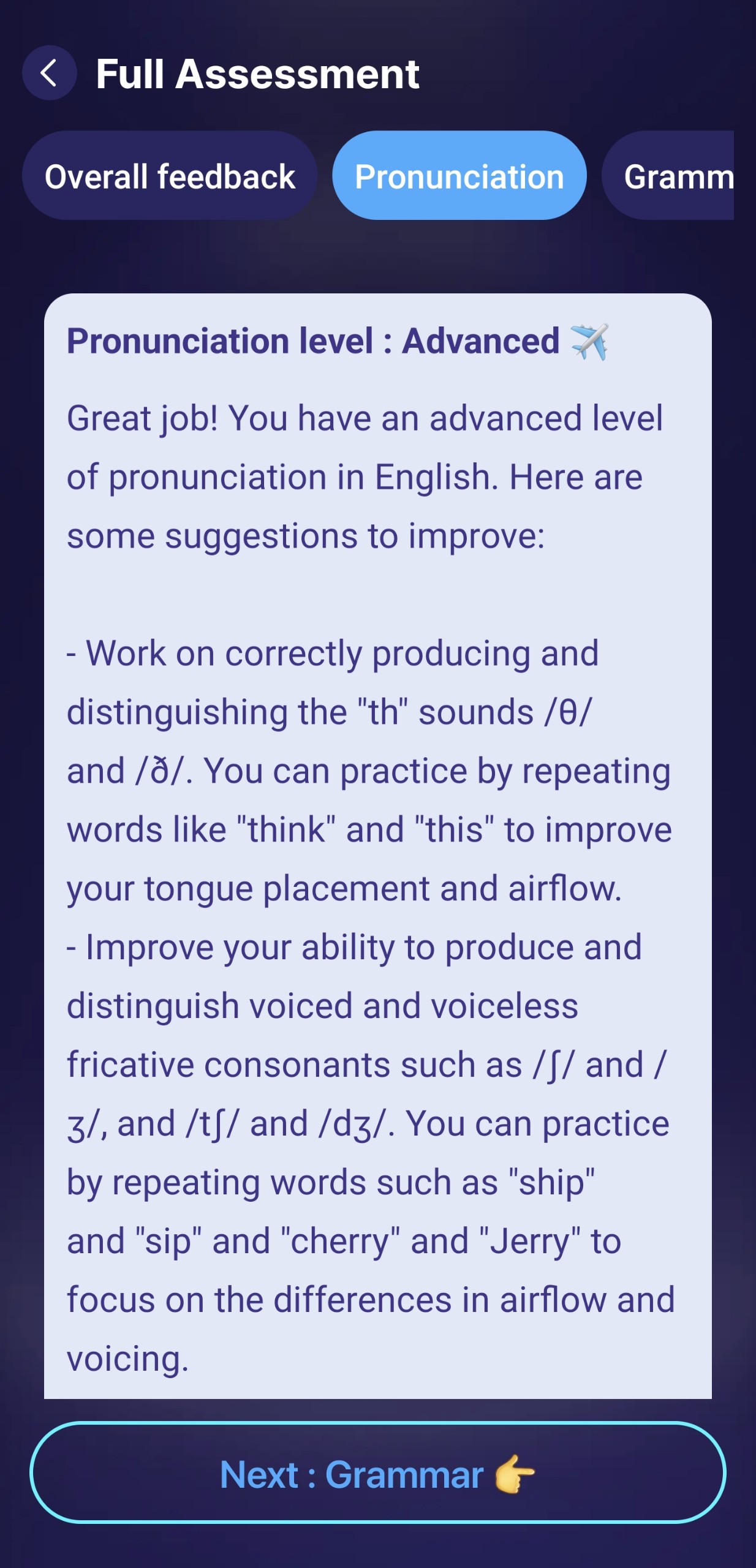At first, I thought ELSA AI was just like other virtual assistants like Bixby, Siri, Bard,… like an AI friend to talk to while we feel bored. However, with its detailed comments and suggestion for learner’s progress on different aspects (grammar, pronunciation, vocabulary), ELSA is more like a “teacher” rather than a mere assistant.
