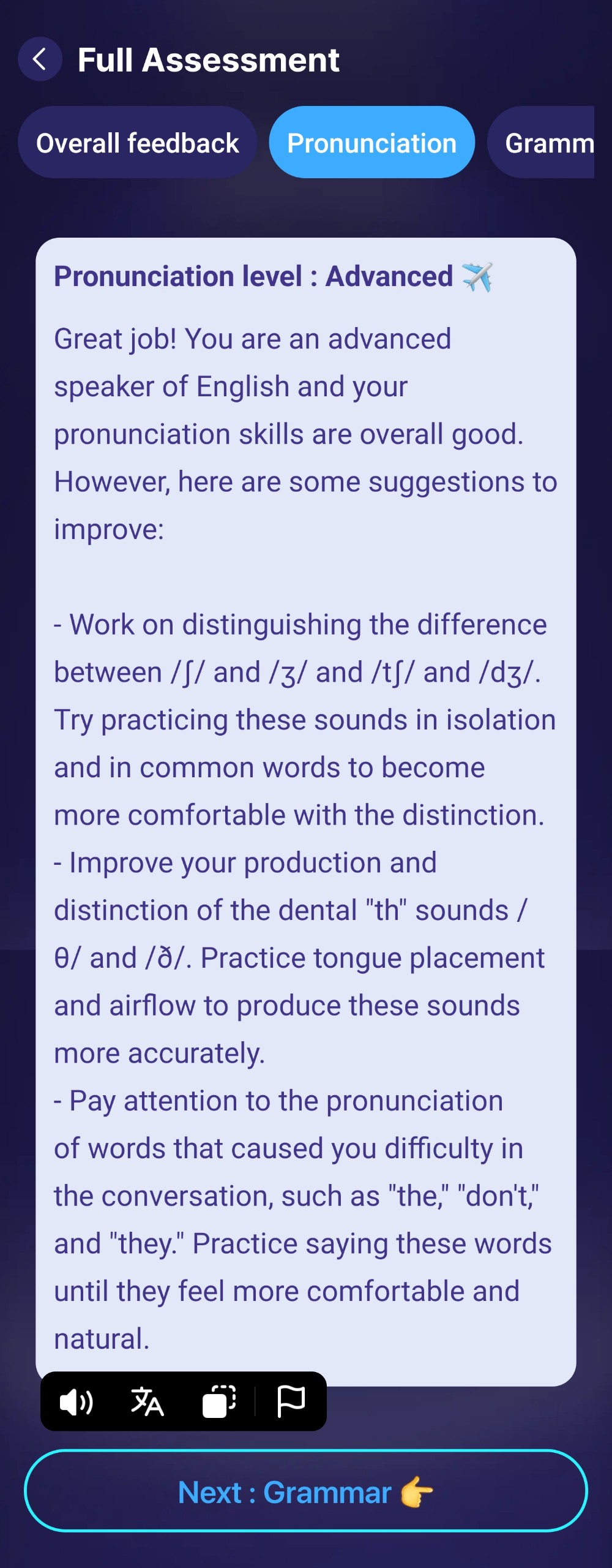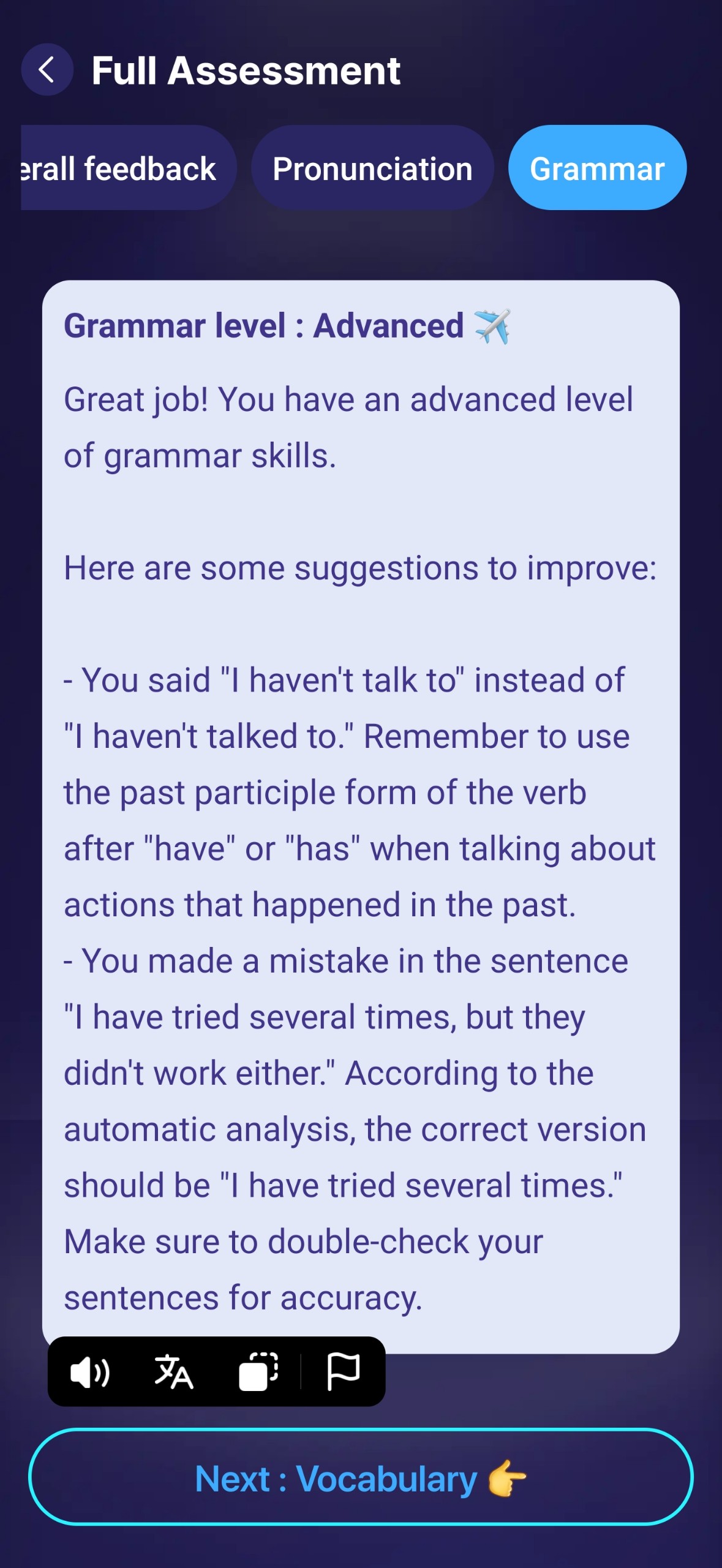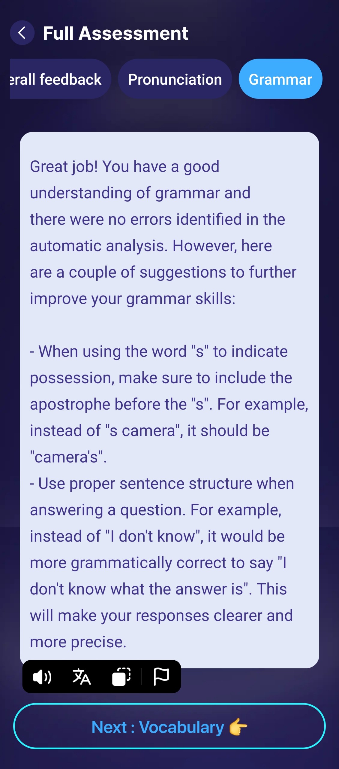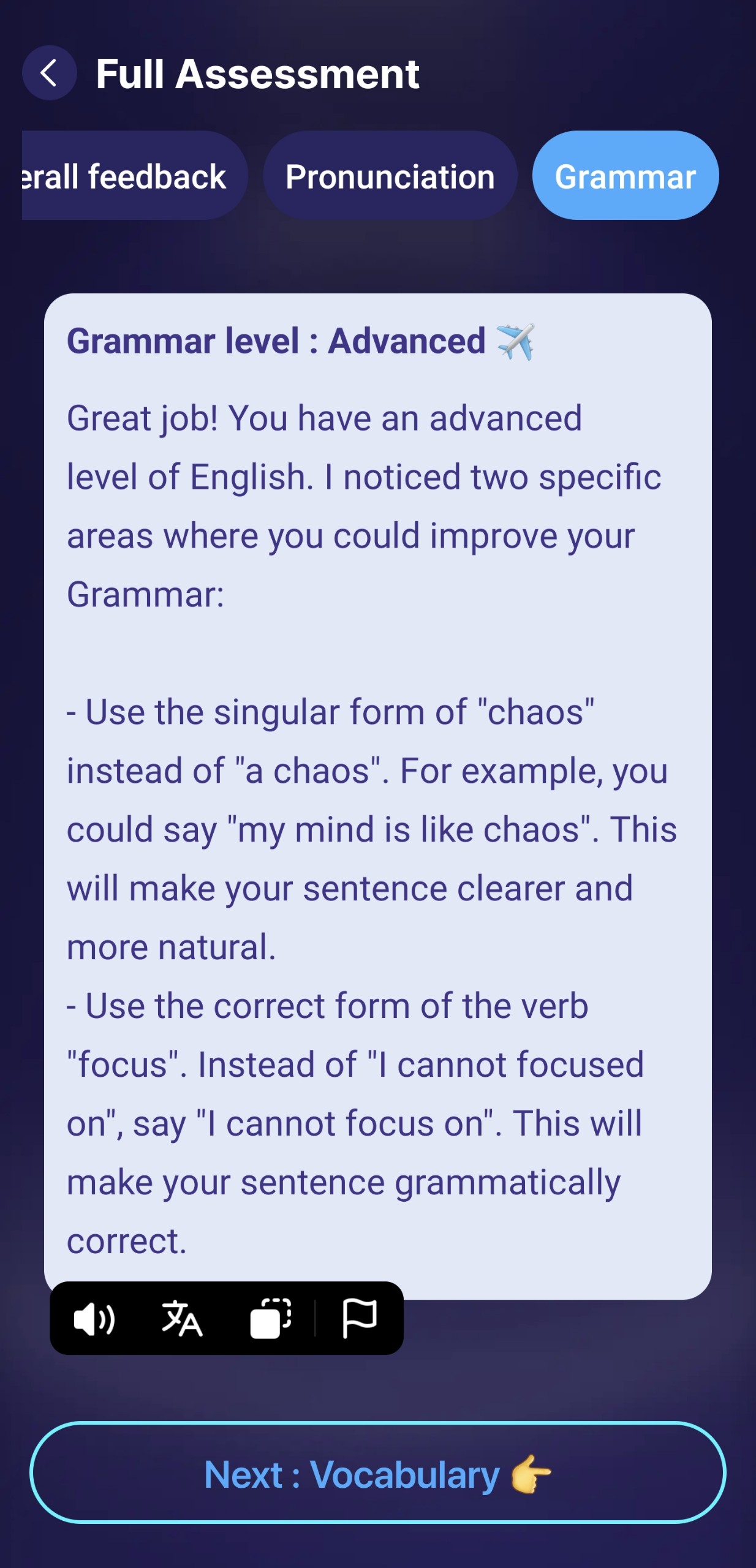 At first, I thought ELSA AI was just like other virtual assistants like Bixby, Siri, Bard,… like an AI friend to talk to while we feel bored. However, with its detailed comments and suggestion for learner’s progress on different aspects (grammar, pronunciation, vocabulary), ELSA is more like a “teacher” rather than a mere assistant.