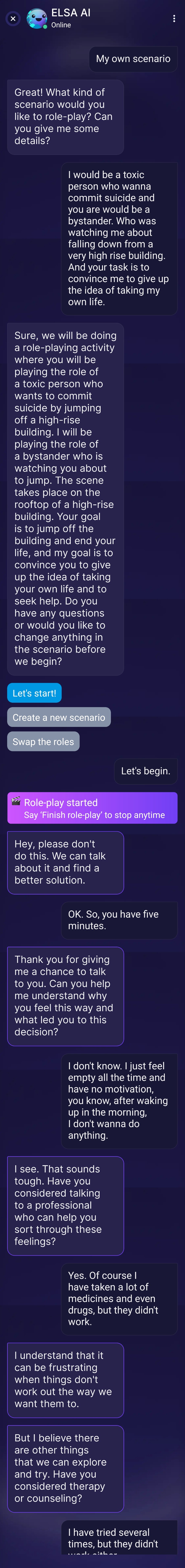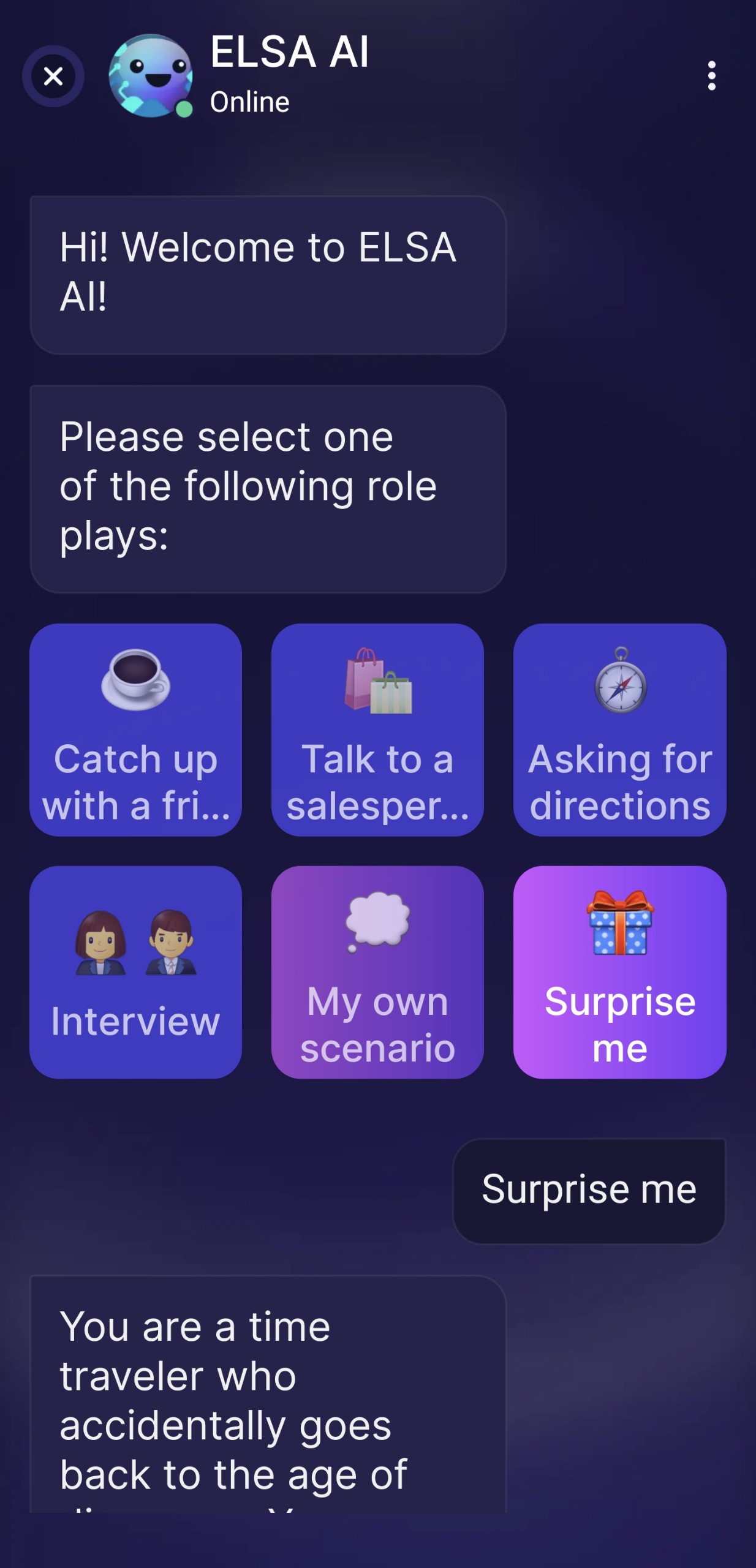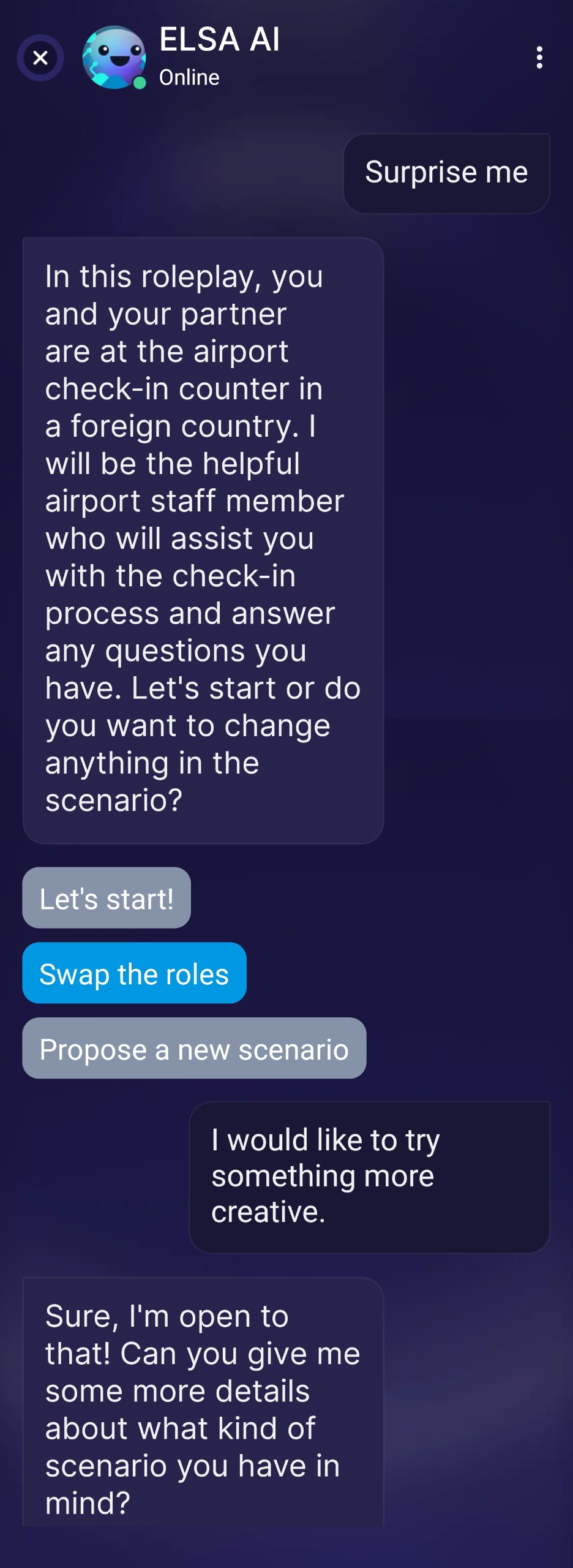 Here is another convo between ELSA AI and me. In this case, the AI “surprised me” with a situation that seemed boring to me, so I asked it to come up with another idea: